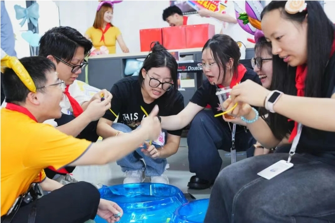 在“童心映好博 成长不停步”主题场,空间被转化为一座记忆博物馆。甩元宝、弹弓射击、漆扇制作等复古游戏与童年零食,铺陈出一条沉浸式时光隧道。在这里,全员褪去职场身份,以孩童视角重新审视初心:通过沙包大作战复盘项目协作,用弹珠轨迹演绎决策逻辑,让职场智慧在嬉戏间自然生长。